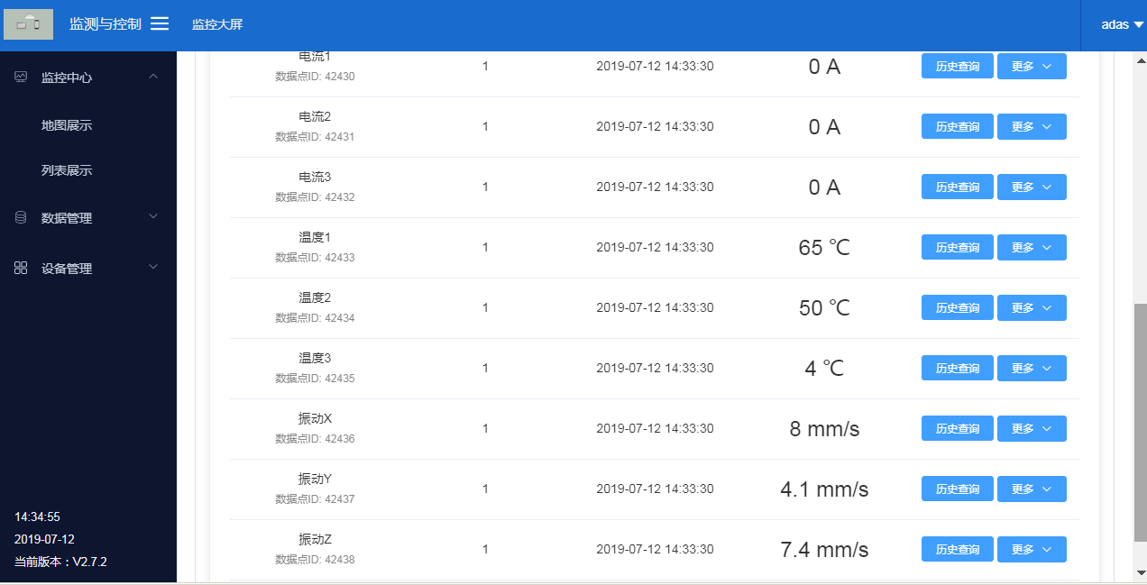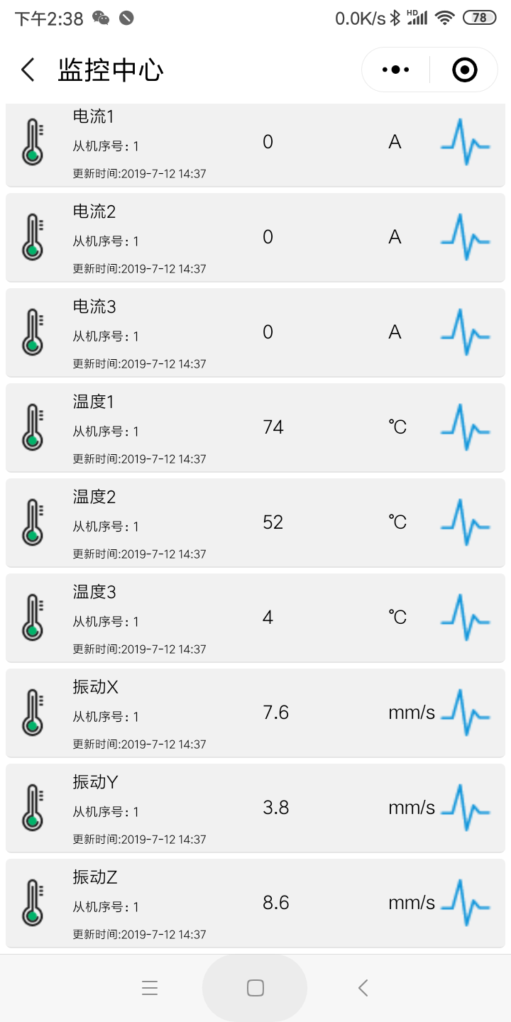 实时监测电机设备运行的2路温度,3轴振动,1路绝缘电流,1路转速所有数据通过NB-IOT无线移动网络(内置SIM卡)实时无线发送,或通过有线RS-485接口实时读取数据。