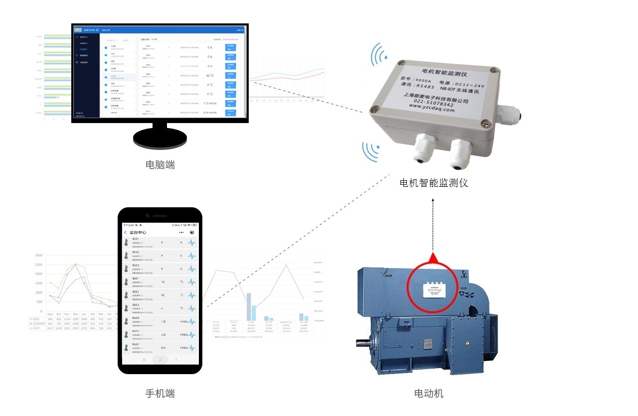 9000A型无线监测模块对电机的健康状态实时管理,实时发送数据到电脑端和手机端,从而达到减少停机时间,延长设备使用寿命,而且低廉的售价。